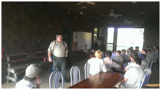 Soon God opened another door for serving others as well as supporting the values and principles that I was raised with and believe in as an Eagle Scout. August 2014 I started a career with the Boy Scouts of America as a District Executive with the Georgia-Carolina Council headquartered in Augusta, GA. My district was the Yamasee District consisting of the counties of Edgefield, Aiken and Barnwell in South Carolina. At the Georgia-Carolina Council I work with other volunteers and youth scouts in my Yamasee District. I also served often as the Camp Medic during camping events and taught the Wilderness First Aid course to some other leaders. Below is a picture of leading a devotional morning service at the camp.